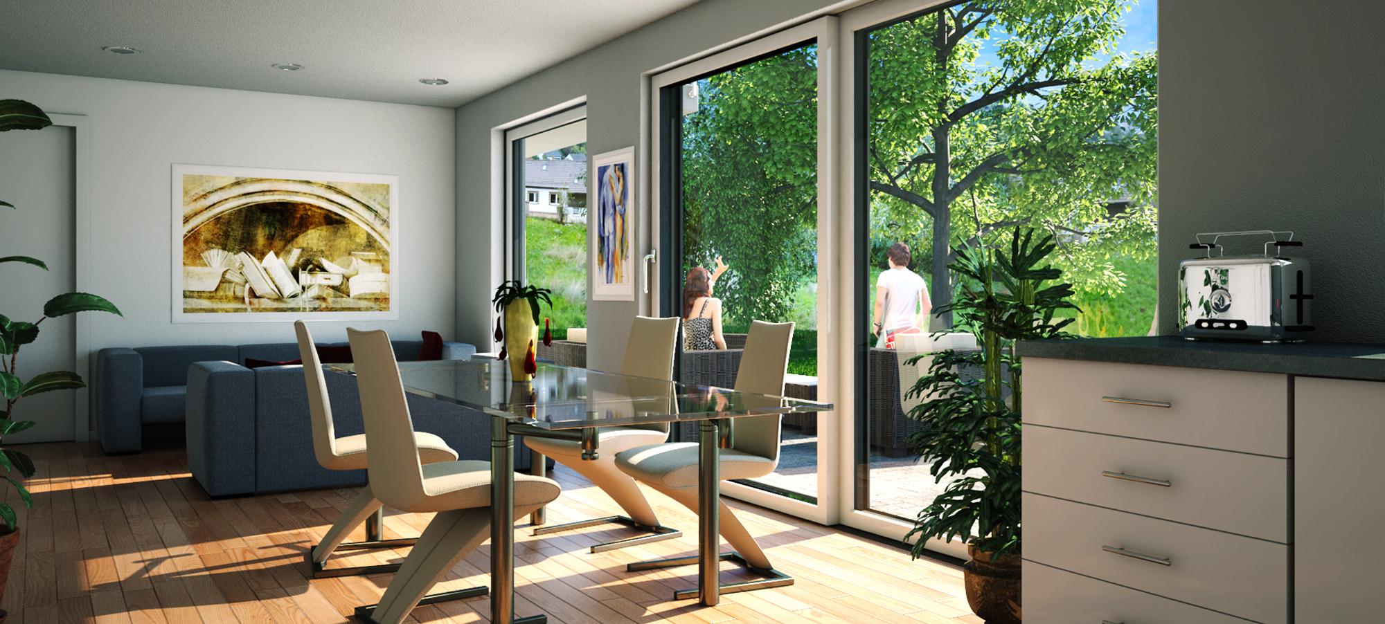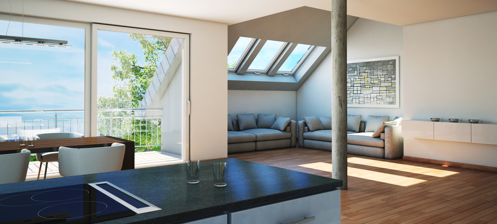 Die 3D-Visualisierung von Gebäuden in ihrer Planungsphase ist mittlerweile ein fester Bestandteil aller Vorbereitungen in den meisten Architekturbüros und wird von Kunden als Standard vorausgesetzt. Wie bei der Produktvisualisierung können auch hier bestehende 3D-Modelle aus allen gängigen Architekturprogrammen übernommen und für ihre Präsentation optimiert werden. Bei Verwendung genauer geografischer Daten können auch reale natürliche Lichtverhältnisse simuliert und getestet werden – außen wie innen. Ein reicher Fundus an Einrichtungsgegenständen sorgt für die richtige Atmosphäre ihrer Präsentation.